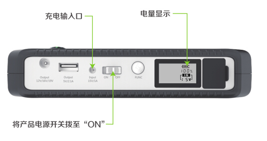 將配套的適配器/充電器插頭插入汽車應急啟動電源的充電輸入口,另一端接入220v市電或者12v車載電器,產品開始充電,電量指示燈循環閃爍,表示已經開始正常充電,電量顯示100%,表示已經充滿!如下圖: